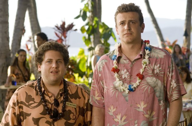 “To clear his head,” Peter heads for a Hawaiian resort “where he is confronted by his worst nightmare!” Sarah and her new guy, a highly sexualized British rock star, are staying in the same hotel. “But as he torments himself with the reality of Sarah’s new life,” he strikes up a relationship with Rachel (Mila Kunis), a “beautiful resort employee” with a “laid-back” approach that “tempts him to rejoin the world.” (You know it’s not me, when you see the word, “rocked.”) I describe the plot thusly: Shit, my ex-girlfriend dumped me. I loved her last week, but she’s a total bitch today.